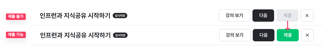 [내 강의 만들기]에서 제출 조건이 모두 충족되면, [제출하기] 버튼이 활성화됩니다. 이 버튼을 클릭하면 강의가 자동 검토 프로세스에 들어갑니다. ※ 유료강의는 제출시 약관 동의 과정이 진행됩니다. 약관동의 완료 후 제출이 완료됩니다.