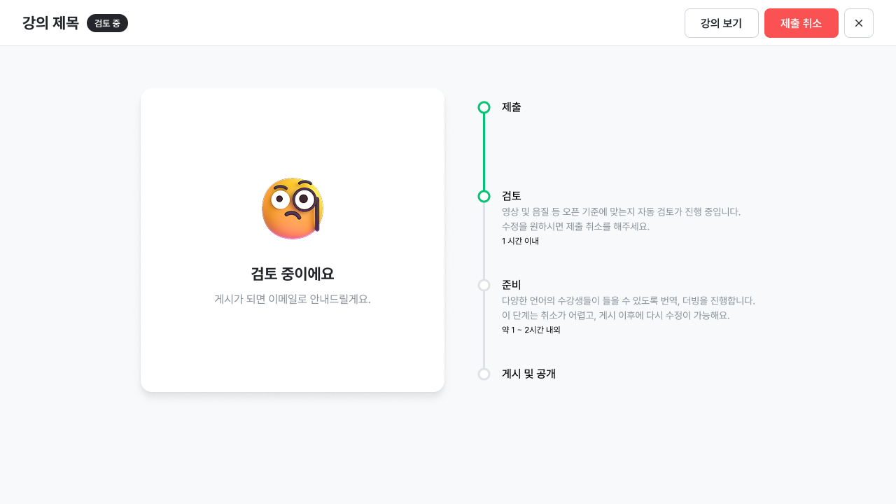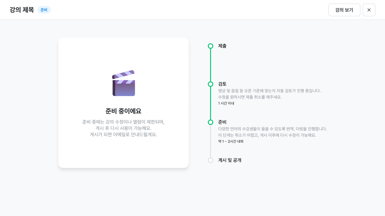 자동 검토를 통과하면, 수강생의 학습 경험을 높이기 위한 준비 작업이 진행됩니다. 번역, 더빙, AI 퀴즈 생성 등의 기능이 이 단계에서 자동으로 적용됩니다. ※ 이 단계부터는 [제출 취소]가 불가하며, 강의 수정이 제한됩니다.