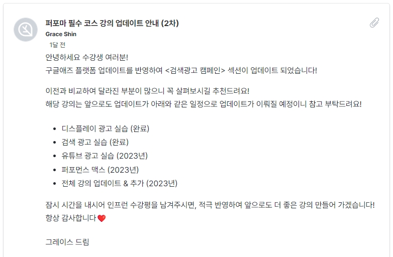 2) 커리큘럼 및 학습 자료 업데이트를 알릴 때