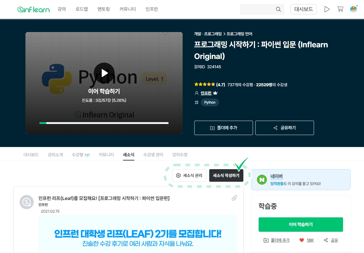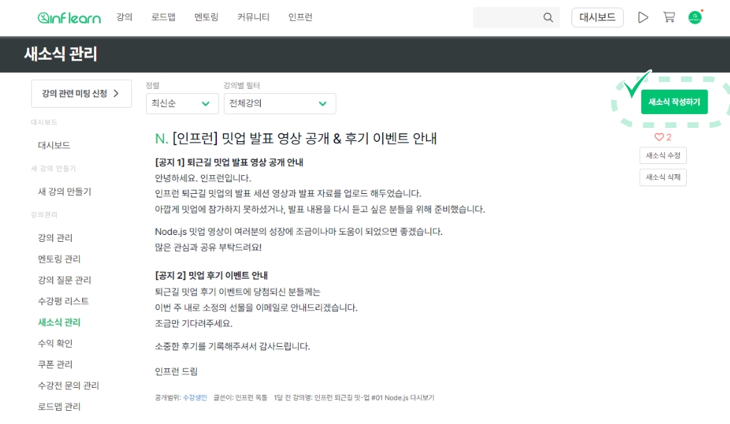1) [강의 상세페이지 > 새소식 > 새소식 작성하기] 버튼을 클릭해 강의마다 새소식을 작성할 수 있어요.