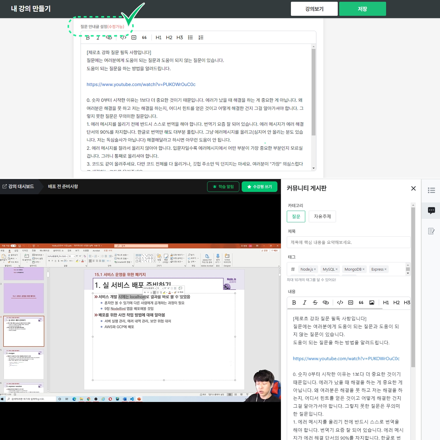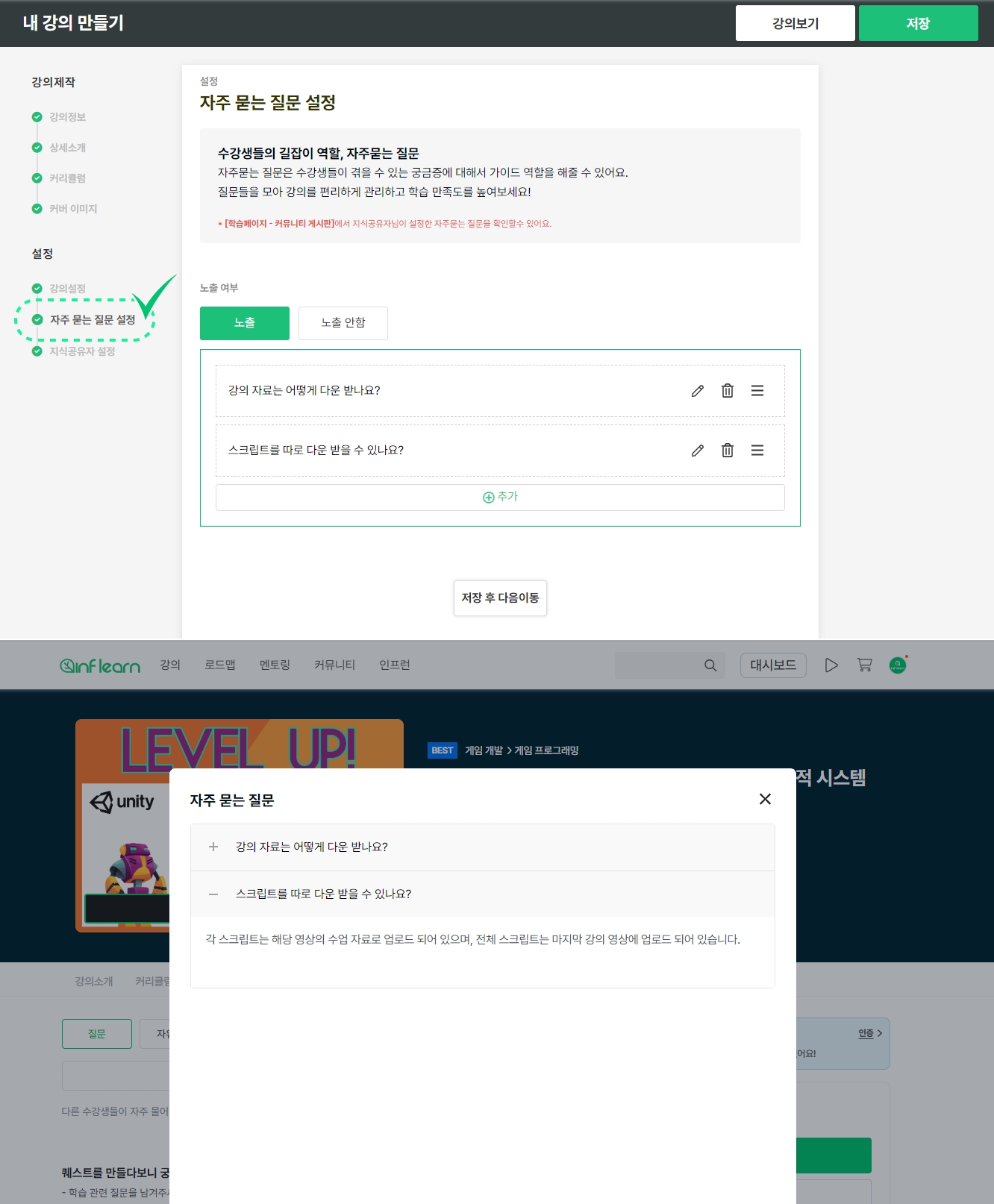 만약 여러 수강생이 커뮤니티에 비슷한 질문을 자주 남긴다면? [강의수정 > 자주 묻는 질문 설정]으로 자주 묻는 질문을 모아 보여주세요.