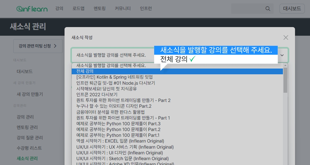 같은 내용의 새소식을 여러 강의에 한꺼번에 발행할 때는 [새소식 관리 > 새소식 작성하기]에서 새소식을 발행할 강의로 [전체 강의]를 설정해주세요. (같은 새소식을 강의마다 따로 발행하면 내 강의를 여러 편 듣고 있는 수강생에게는 메일이 여러 번 발송돼서 새소식의 효과가 떨어질 수 있어요.)