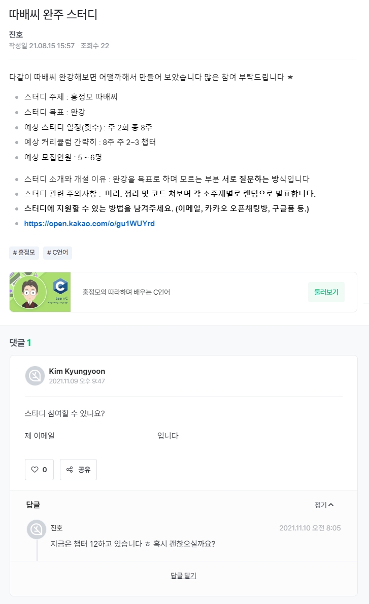 스터디는 공부하며 모르는 내용을 서로 알려주거나, 함께 의지를 다지고 싶은 분들을 위해 만들어졌어요. 강의를 함께 들으면서 관련 주제에 대해 같이 공부할 수 있도록, 수강생들에게 스터디 활용을 독려해보시는 것도 추천해드려요! 완강률을 좋은 방향으로 끌어올릴 수 있어요.