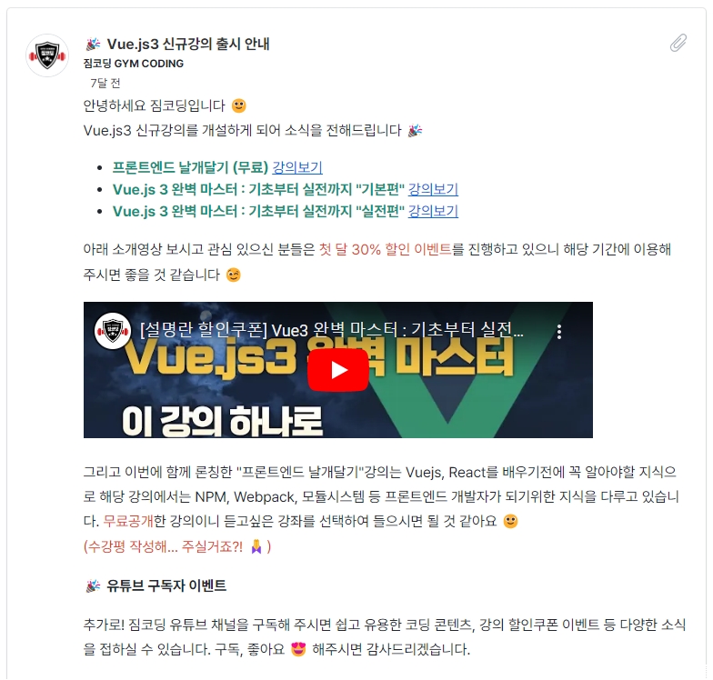 진행하고 계신 수강생 이벤트가 있나요? 수강생들이 관심을 가질 수 있도록 새소식을 활용해보세요! 지난 [쿠폰 100배 활용하는 방법], [할인으로 내 강의 더 알리기] 편에서처럼 할인 관련 소식을 수강생에게 알릴 수도 있어요.