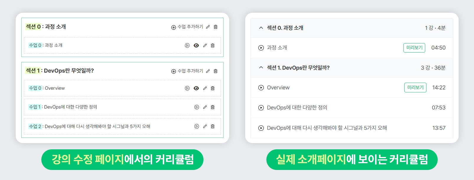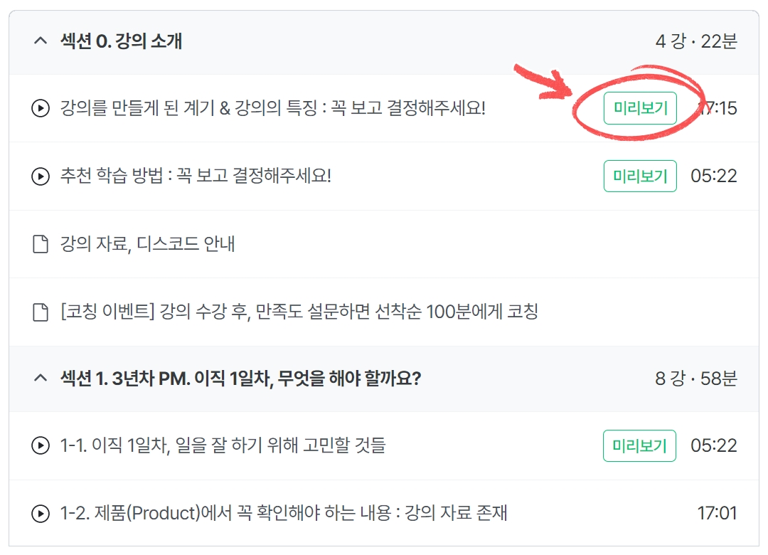 무료공개로 설정한 수업은 강의 커리큘럼 수업명 옆에 [미리보기] 태그가 붙습니다.