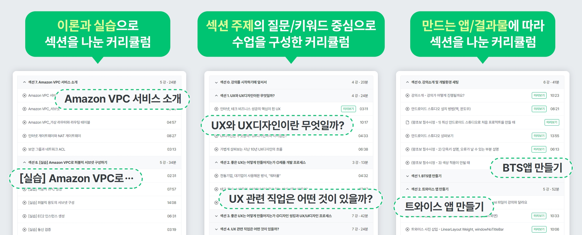 섹션을 잘 나누어 구성한 커리큘럼은 그렇지 않은 커리큘럼에 비해 훨씬 효과적이에요. 보통 한 섹션 당 3~5개의 수업으로 구성하는 걸 추천합니다.